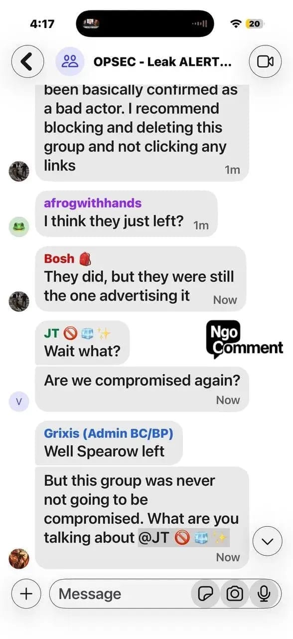 Inside the chats, disappearing messages are enabled by default. Nearly all users operate under aliases. Administrators warn participants never to write anything they would not want read back in court. Members are vetted, cross referenced across other groups, and purged if suspected of being outsiders or law enforcement. Organizers openly discuss deleting chats entirely to destroy evidence when they believe a group is compromised.