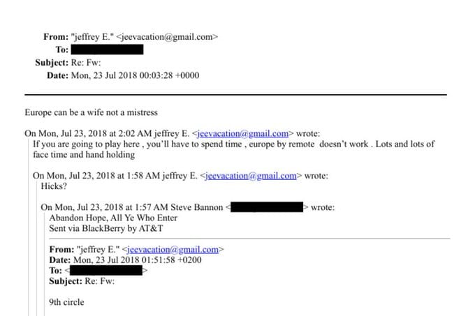 According to CNN, Epstein told Bannon he needed to "understand flow of funds" and called some of Bannon's ideas "brilliant," offering to help develop arguments. Epstein also arranged foreign introductions and warned Bannon to "take no heat re me."