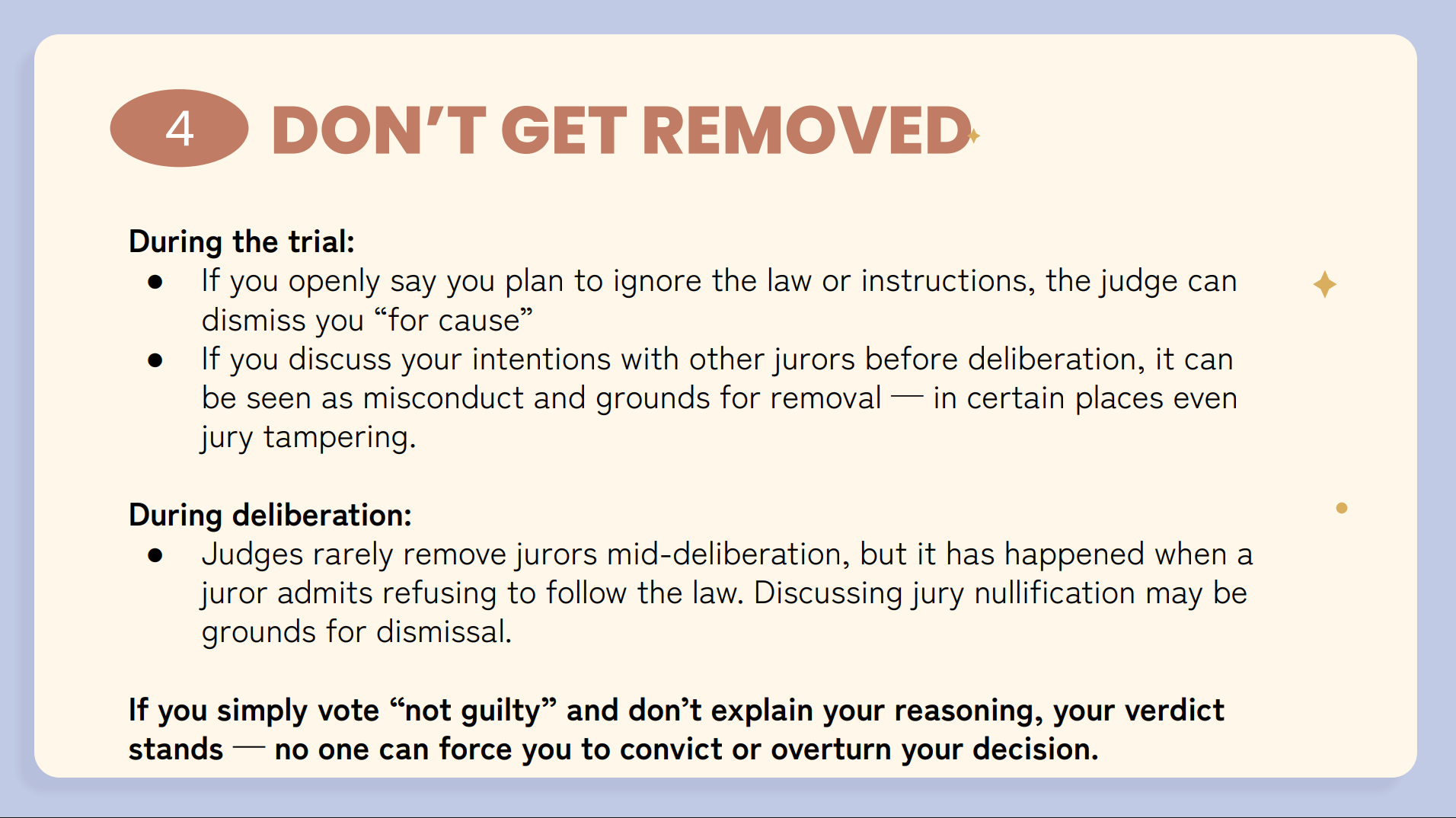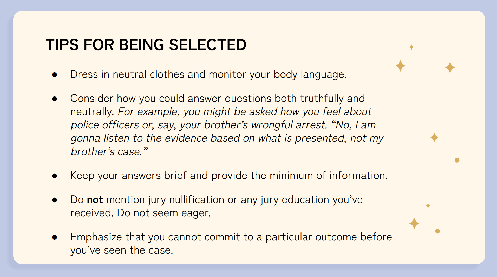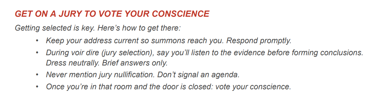 The playbook is methodical and deliberate. Keep your address current so jury summons keep coming. During selection, dress neutrally, give brief answers, never mention jury nullification, and tell prosecutors you will consider all the evidence with an open mind. Get seated. Then vote not guilty for any reason you want.