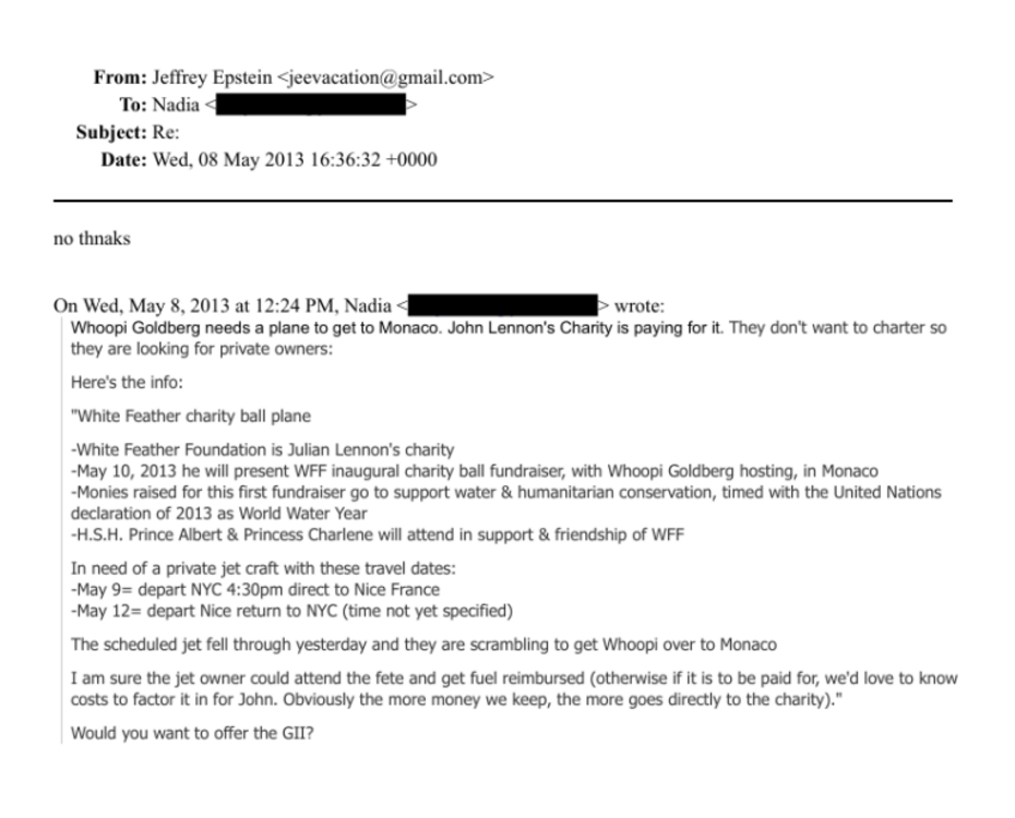 The most troubling revelation involved emails sent years after Epstein’s conviction. NewsBusters found correspondence from a redacted address appearing to act on Goldberg’s behalf, requesting access to one of Epstein’s private jets. The email asked whether Epstein’s Gulfstream GII could transport Goldberg to a White Feather Foundation charity event in Monaco, citing short notice and cost concerns. Epstein declined with a brief response reading “no thnaks.”