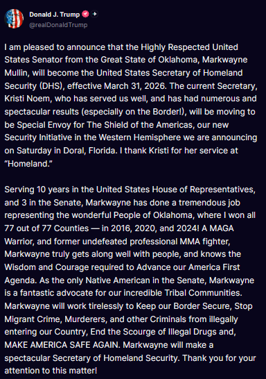 Trump shared the announcement on Truth Social, saying Noem would move to a newly created position focused on Western Hemisphere security while Mullin prepares to take over leadership of the department responsible for border security, immigration enforcement, and domestic safety.