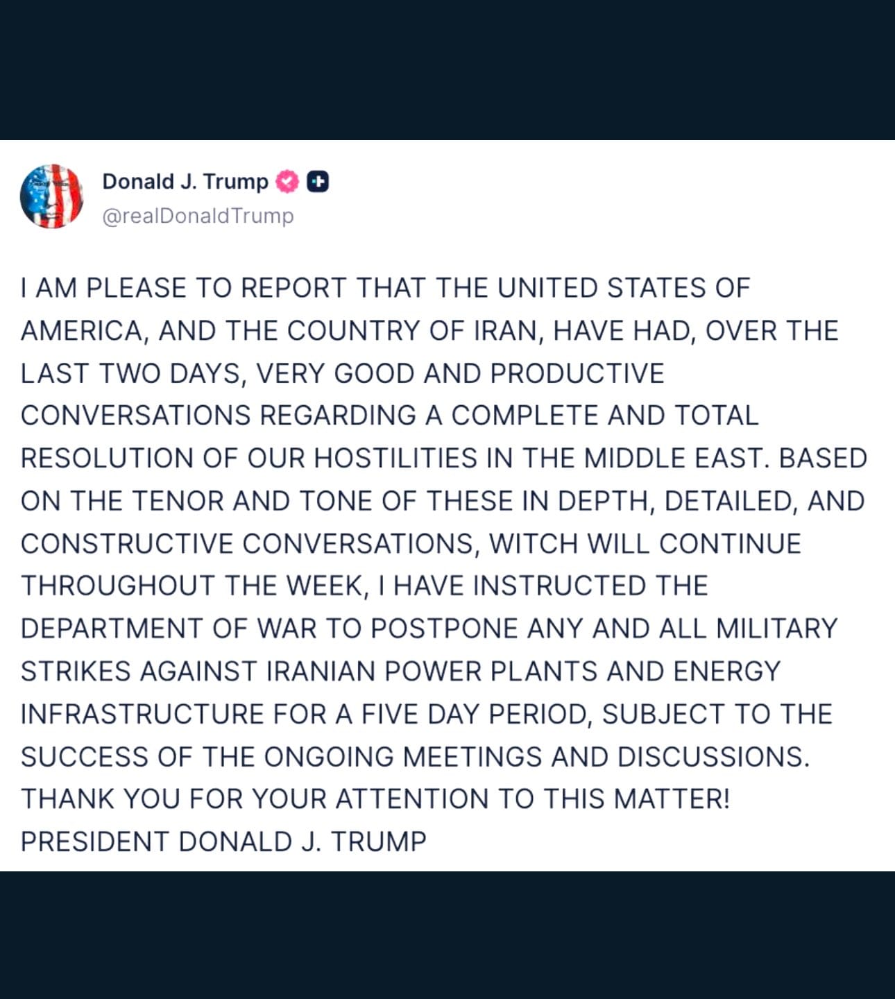 "I am pleased to report that the United States of America, and the country of Iran, have had, over the last two days, very good and productive conversations regarding a complete and total resolution of our hostilities in the Middle East," Trump wrote. "Based on the tenor and tone of these in depth, detailed, and constructive conversations, [which] will continue throughout the week, I have instructed the Department of War to postpone any and all military strikes against Iranian power plants and energy infrastructure for a five-day period, subject to the success of the ongoing meetings and discussions."